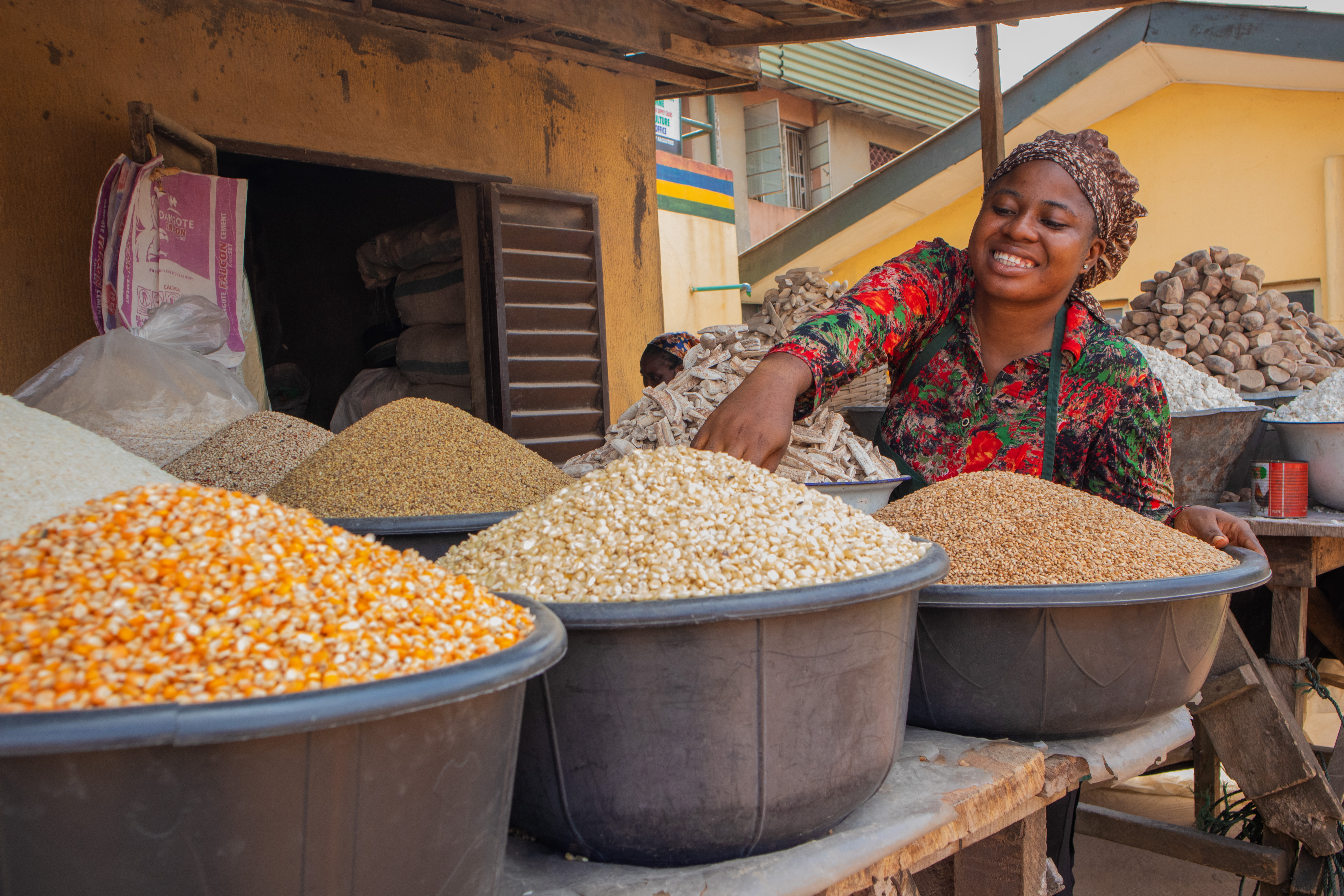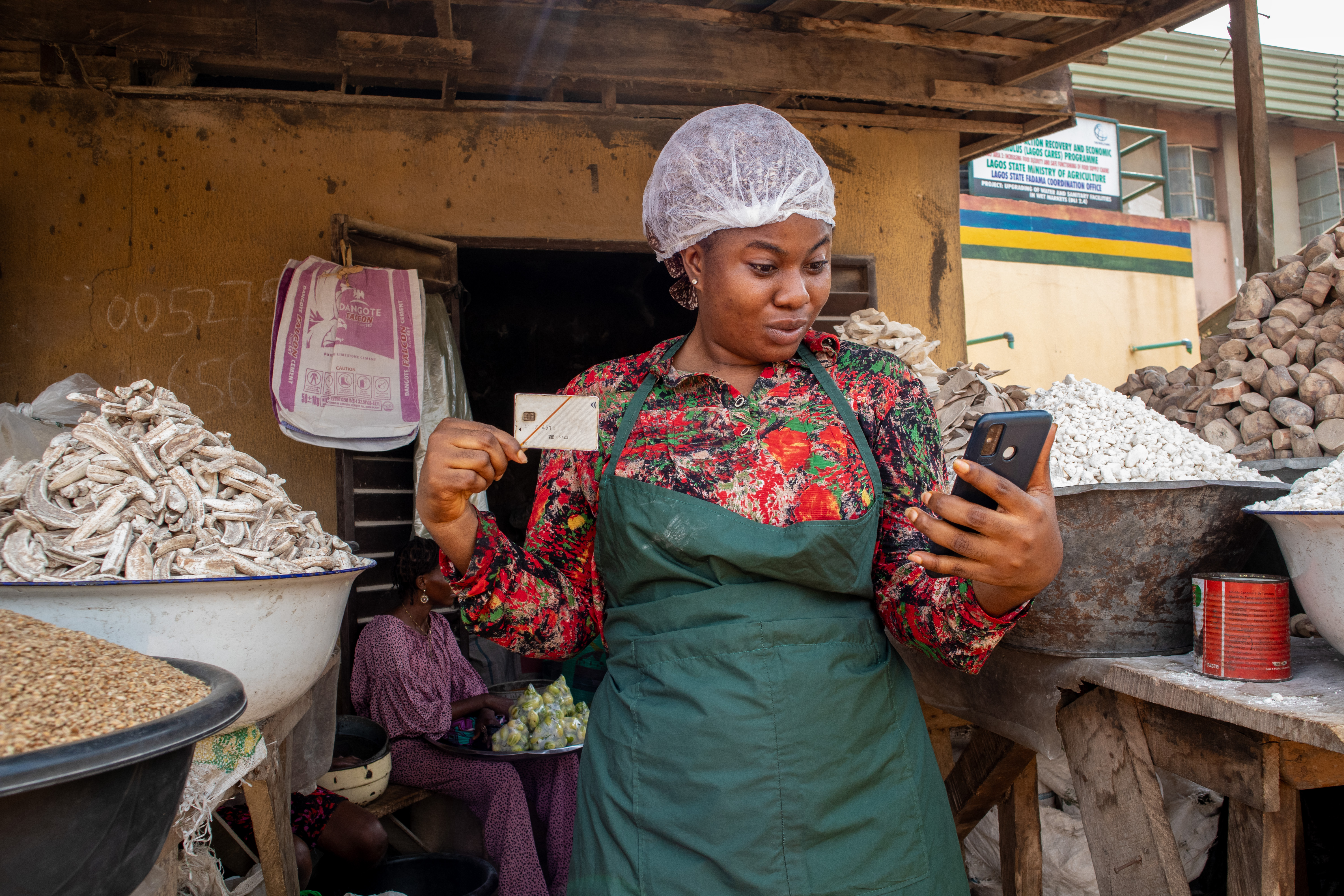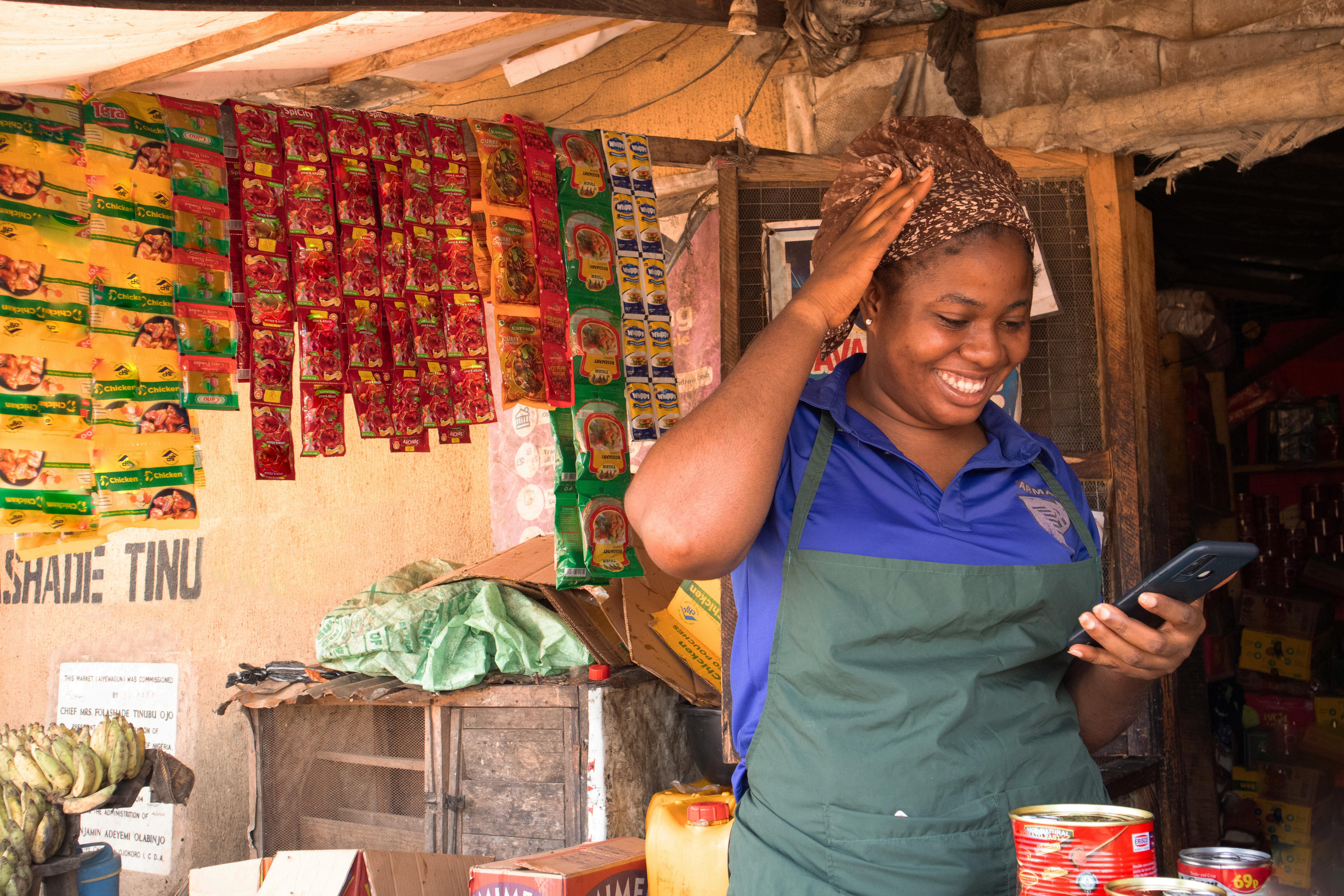 Happy Market Woman Holding Naira Note and POS Machine in Front of Her Shop