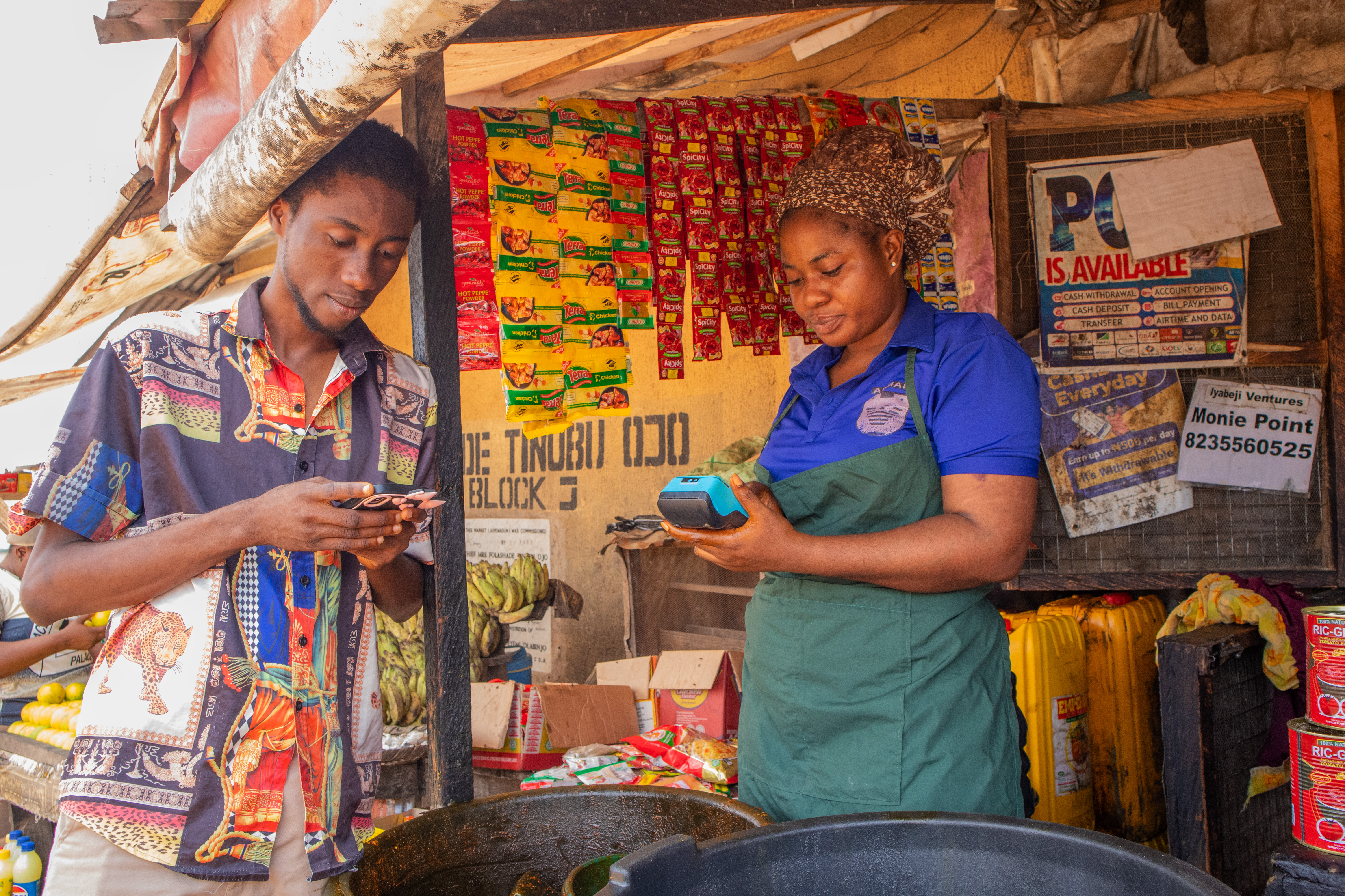 African Woman Holding a POS Terminal in Front of Her Shop  Modern Retail in Africa