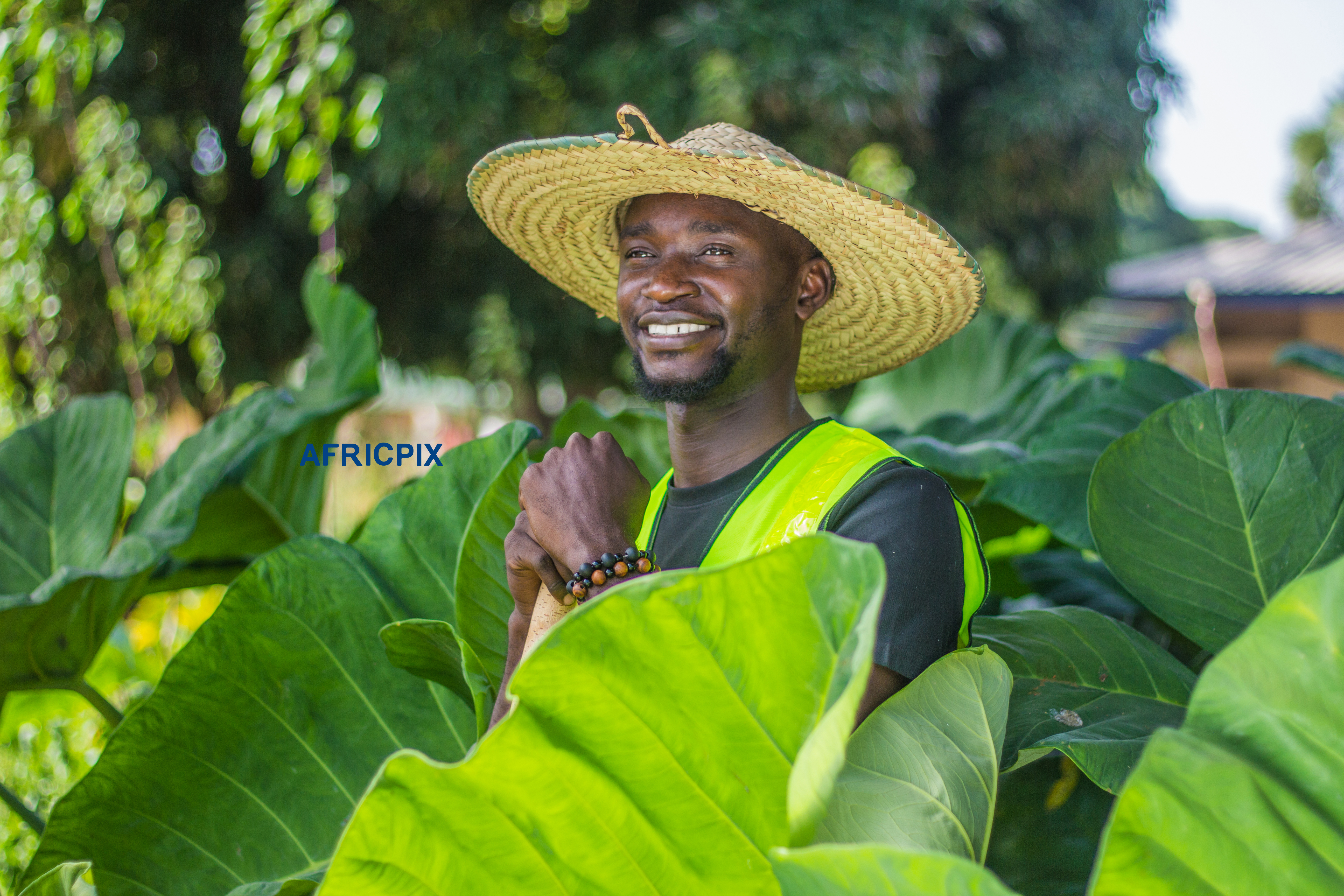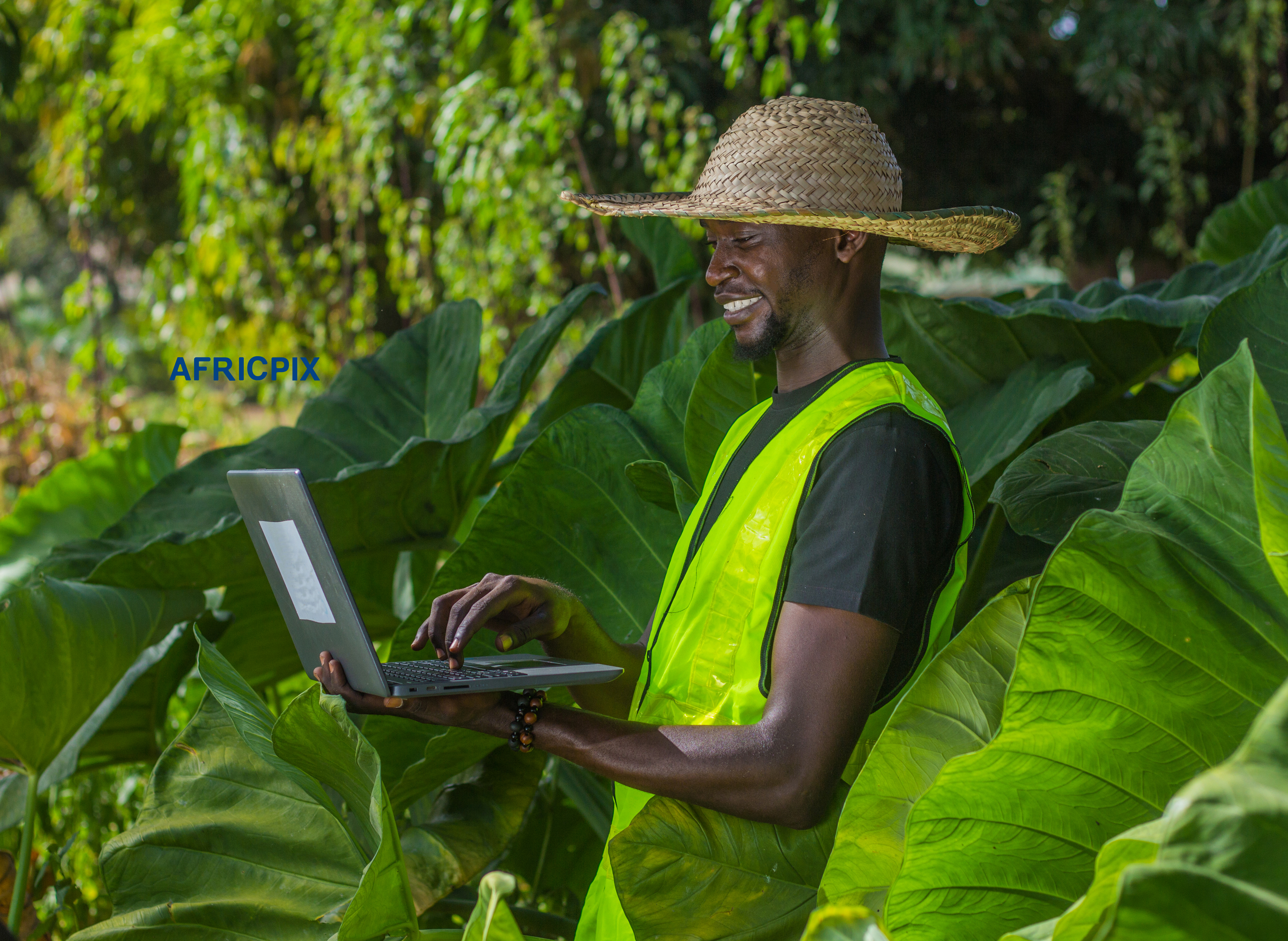 African male farmer in a farm setting, wearing a hat and using a laptop-man 2