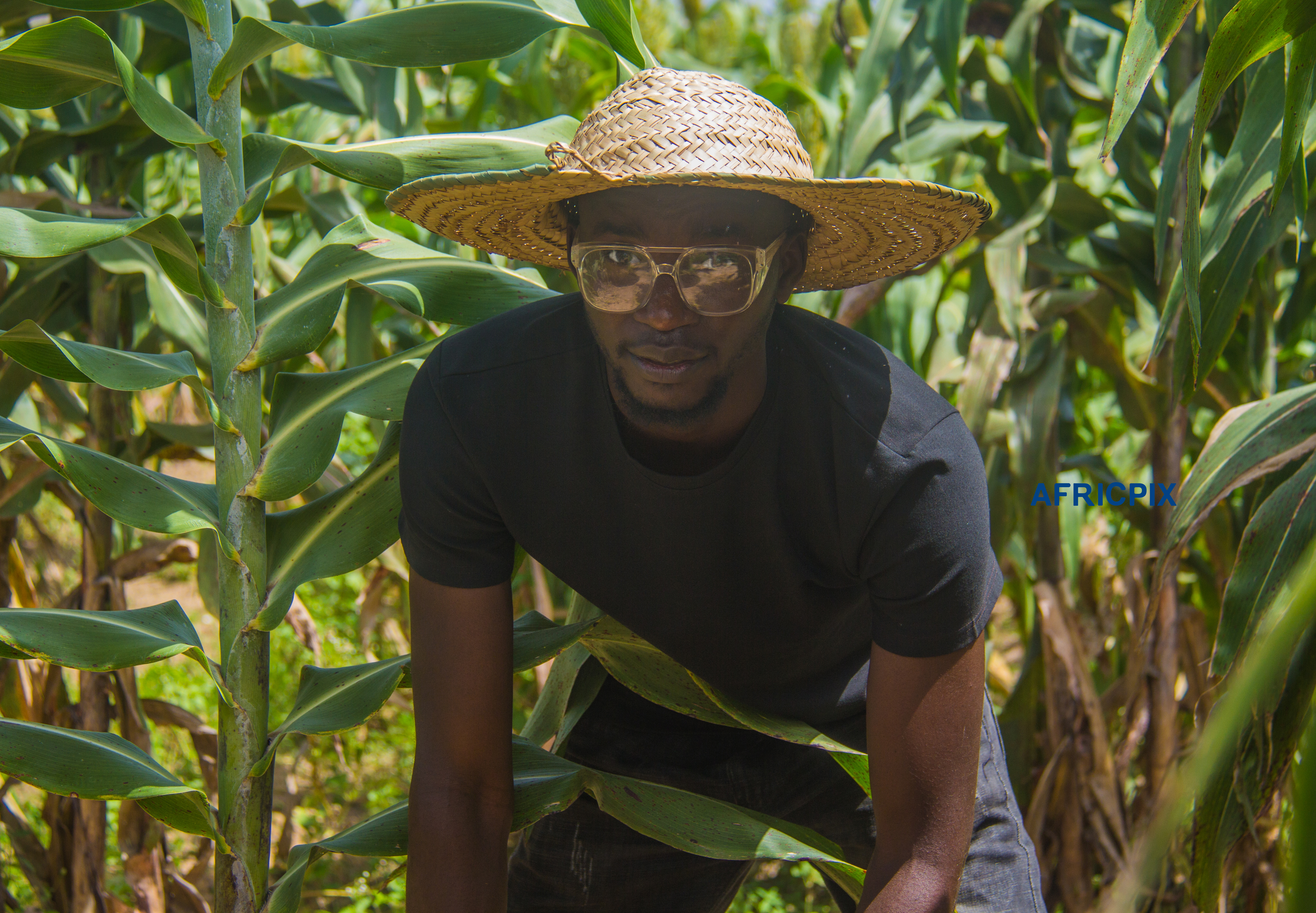 African farmer standing on a farm, wearing glasses and a hat, looking focused while working outdoors male-man